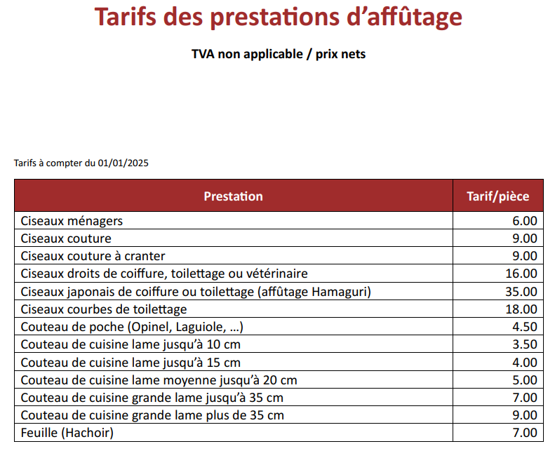 Vous m'envoyez vos outils (couteaux, ciseaux), à réception je les affûte puis je vous transmets la facture, vous réglez par virement et je vous retourne vos outils fraîchement affûtés.